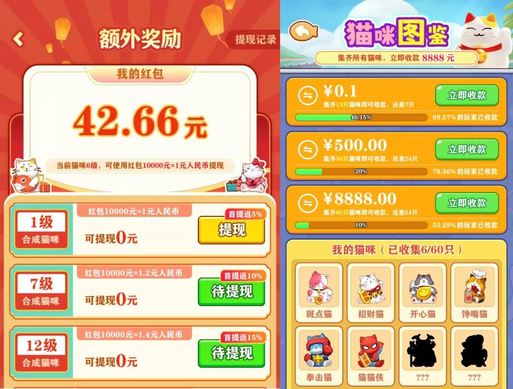 还有那个猫咪图鉴奖励,说能提现8888元,我一看条件直接懵了,得合成60级猫。咱就说,这60级猫得熬多少夜、看多少广告才能合成啊,估计等我合成了,手机都该换好几代了。