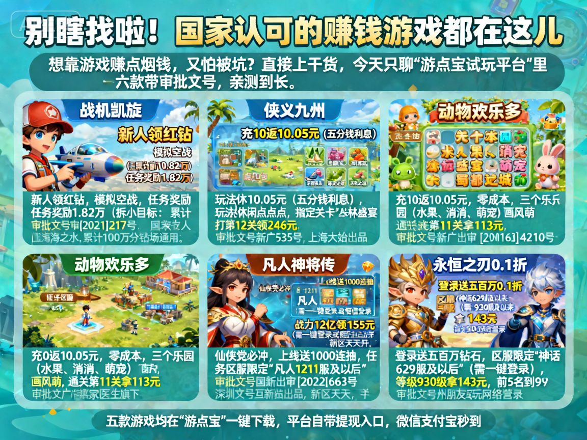想靠游戏赚点烟钱,又怕被坑?直接上干货,今天只聊“游点宝试玩平台”里六款带审批文号的正规货,款款都能拿现金奖励,提现门槛低到离谱,亲测到账。